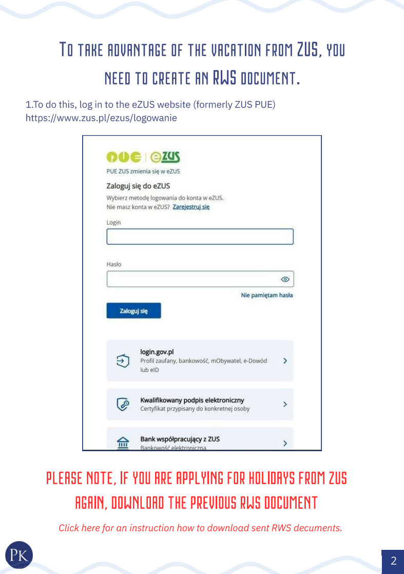 A practical, step-by-step guide showing how to correctly submit an application for contribution holidays in eZUS in the RWS/RWS-D document. The document supports entrepreneurs at every stage of the process – from logging in via a bank or trusted profile, through going to the Payer → Application Creators → Application Creators section, selecting the month of exemption, to signing and sending using the PUE profile signature. For entrepreneurs who value: time savings, formal correctness and process security.