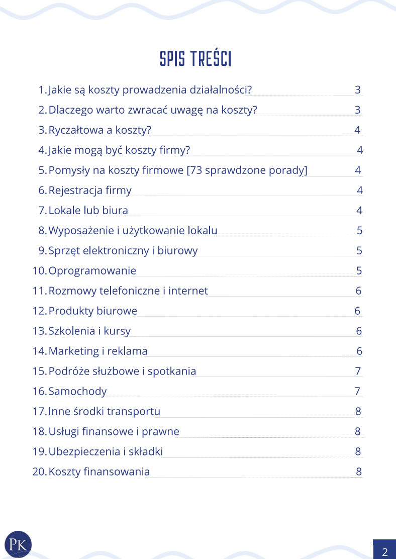 Gotowa do użycia w biznesie lista 72 przykładowych, zgodnych z polską praktyką podatkową kosztów firmowych dla jednoosobowych działalności i spółek. Zawiera sprawdzone kategorie wydatków: od rejestracji firmy i lokali, przez sprzęt, oprogramowanie i marketing, po koszty transportu, finansowe, prawne i ubezpieczeniowe. Idealny materiał inspiracyjny, pomocny w legalnym planowaniu podatkowym i porządkowaniu ksiąg